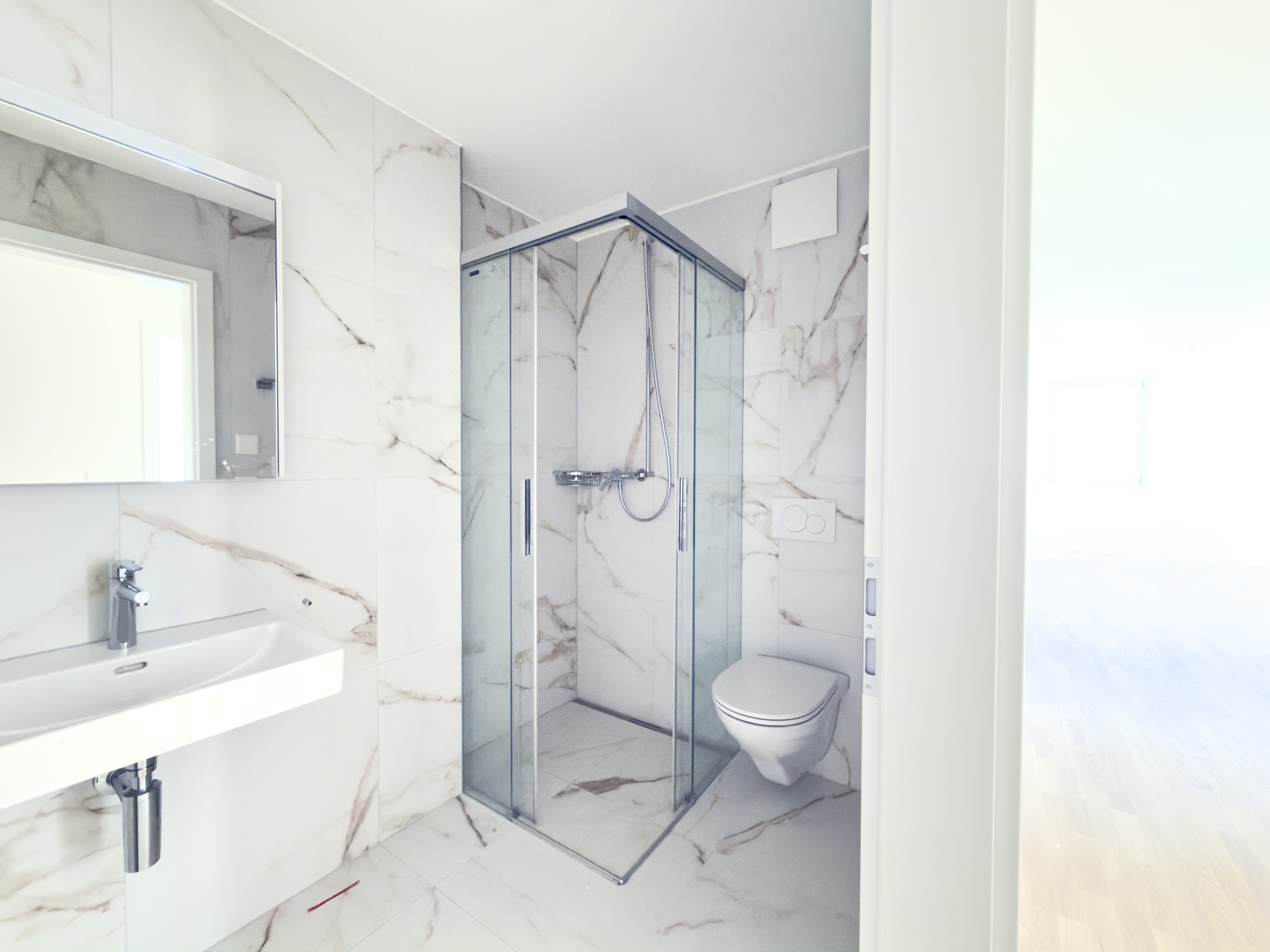 Ein besonderes Highlight ist das attraktive Hauptschlafzimmer mit En-Suite Bad/WC. Zusätzlich verfügt diese Eigentumswohnung über einen separaten Dusche/WC-Raum. Die beiden Nasszellen sind mit beigen Keramikplatten ausgestattet, was den modernen, zeitlosen Charakter der Wohnung unterstreicht.